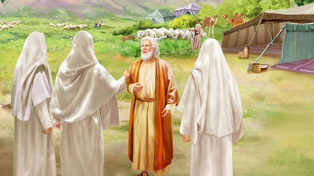 2 . აღაპყრო თვალები და ხედავს, სამი კაცი დგას შორიახლოს; დაინახა, კარვის კარიდან მათ შესახვედრად გაიქცა და მდაბლად სცა თაყვანი.