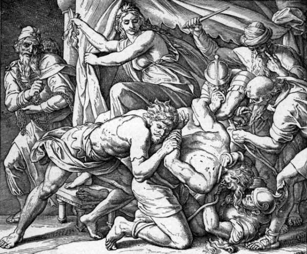 21 . და აიღო იაყელმა, ხებერის ცოლმა, კარვის პალო და ურო, ფეხაკრეფით მიეპარა სისარას; მოუქნია და ისე ჩაურჭო პალო საფეთქელში, რომ მიწას დააჭედა. ის კი დაღლილი და ღრმად ჩაძინებული მოკვდა.