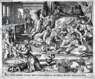 24 . სამი თვის შემდეგ ამცნეს იუდას: "შენმა რძალმა თამარმა იბოზა და ორსულადაა ახლა”. თქვა იუდამ: "გამოიყვანეთ, რათა დაიწვას”.