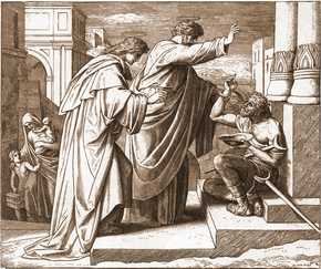 2 . იყო კაცი ვინმე, დედის მუცლიდანვე დავრდომილი. ყოველდღე მოჰყავდათ და სვამდნენ ტაძრის "მშვენიერად” წოდებულ კართან, რათა ტაძარში შემომსვლელებისთვის მოწყალება ეთხოვა.