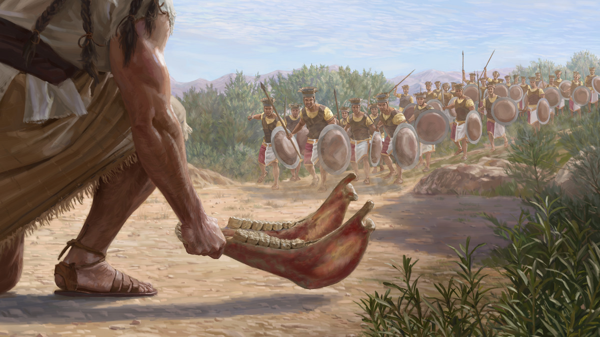 15 . იპოვა სახედრის ნედლი ყბა, გაიწოდა ხელი, აიღო და ათასი კაცი მოსრა მისით.