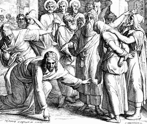 6. ხოლო ამას საცდუნებლად ეუბნებოდნენ, რათა ბრალი დაედოთ მისთვის. იესო კი დაბლა დახრილიყო და თითით რაღაცას წერდა მიწაზე.